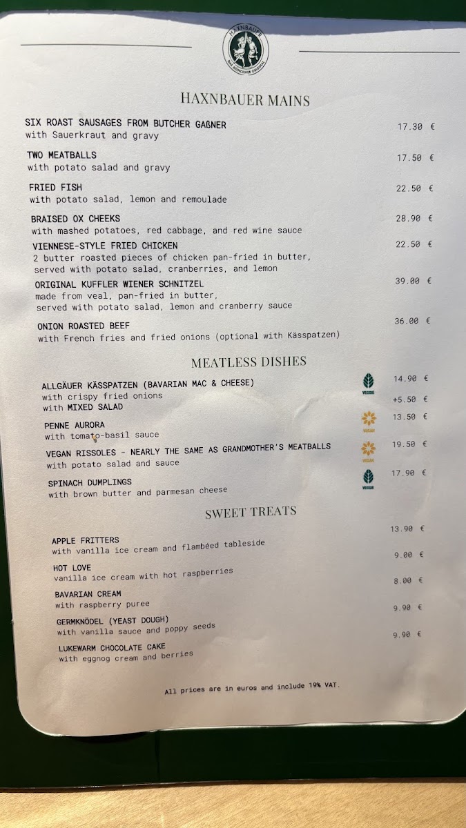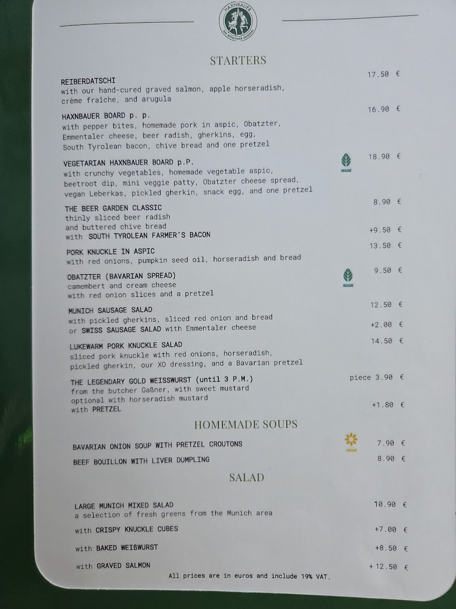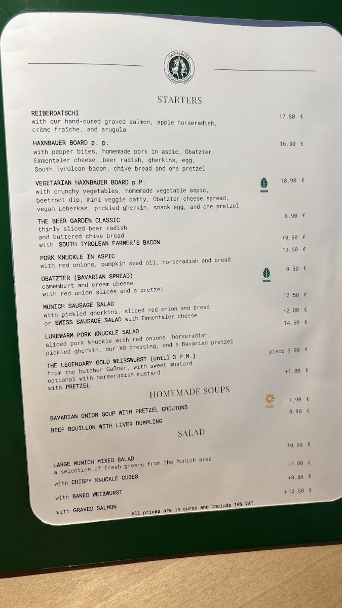 The menu at Haxnbauer features traditional German cuisine with a focus on classic Bavarian dishes. Visitors can expect a variety of main courses centered around pork and veal knuckles, including grilled and roasted preparations. The offerings also include soups such as mushroom soup, salads, and selections featuring salmon and South Tyrolean bacon served with chive bread.