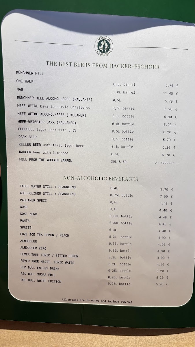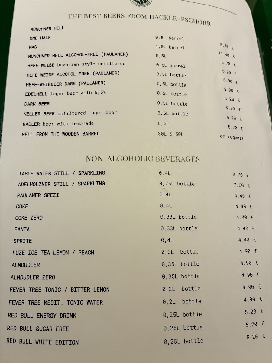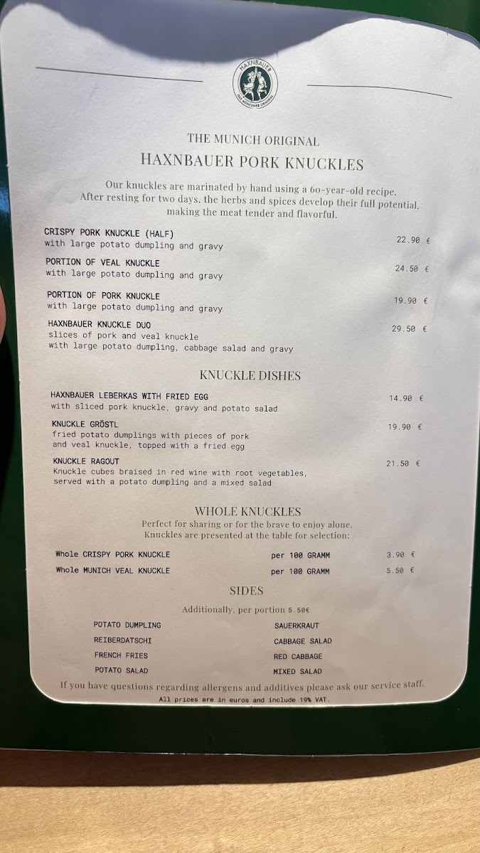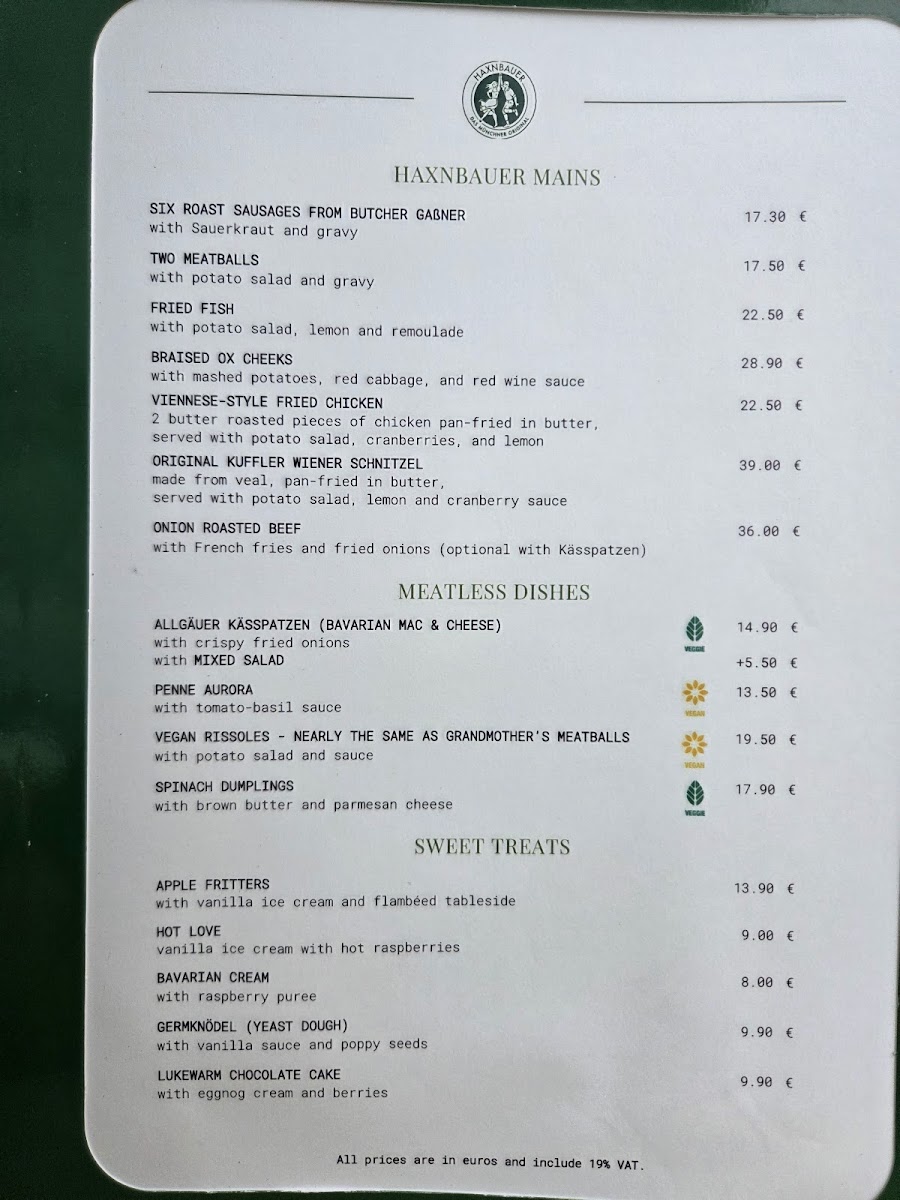 The menu at Haxnbauer features traditional German cuisine with a focus on classic Bavarian dishes. Visitors can expect a variety of main courses centered around pork and veal knuckles, including grilled and roasted preparations. The offerings also include soups such as mushroom soup, salads, and selections featuring salmon and South Tyrolean bacon served with chive bread.